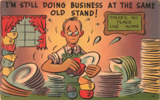 In most cases, postcard cartoonist regarded the poor chap who had to wash the dishes after supper as not so much inept as overworked. (How much does his family rt, by the way? The sink is almost as bad as the one confronted by that chap in the Army two paragraphs ago.)