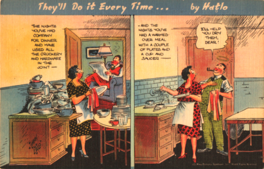 While men who moved straight from the house where Mom took care of these little details to their own establishment, where their Dearest expected them to help out greeted this revolting development with a plain old pout.