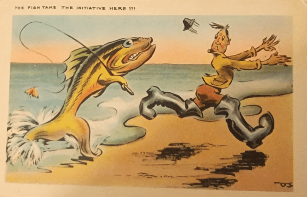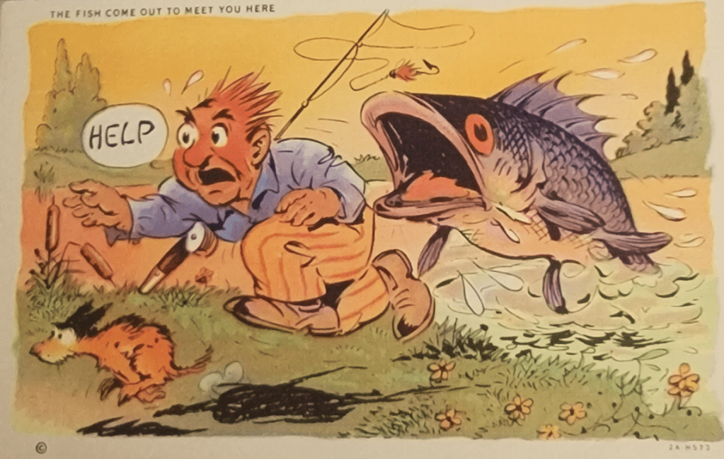 It has been a while since we discussed fishing postcards. These were wildly popular in the middle of the last century, when people stopped sending postcards the way our modern generation sends texts, and instead made postcards a vacation staple: something you sent to the folks at home while you were on a fishing trip. I have no shortage of fishing postcards in my inventory, and thought we could discuss them whilst I subtly, so subtly advertised my wares.