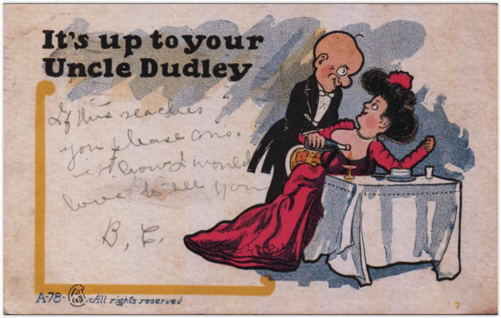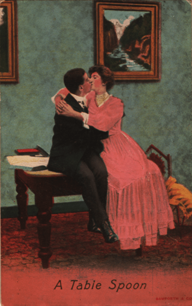However, the piece of furniture coming closest to the chair or the settee for romantic couples in postcards is probably the table. (What? Beds? This was a hundred years ago, klddo socko: couples were found on or in beds only in cards featuring married couples having a fight, or naughty postcards, which we will discuss at some future date. By the way, the really naughty cards didn’t use beds either: blankets would obstruct the view.)