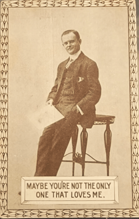 We have discussed, hereintofore, a number of important props used by courting couples on postcards of a hundred years ago or thereabouts. We have discussed park benches, rowboats, and hammocks. But romance is nothing if not inventive (say several websites that have turned up on my computer for absolutely NO REASON) and there were plenty of other possibilities.