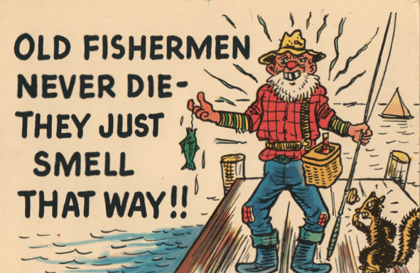 This postcard is part of an avalanche of jokes made after Douglas MacArthur’s farewell speech, in which he used the phrase “Old soldiers never die; they just fade away.” Parts of that would have made a good quiz question on their own, but no, I was going to ask where HE got the line. And the answer is simple enough: it comes from a song that was popular in the army when MacArthur was a young man. No one seems to know EXACTLY when it came about or where it came from, and that sort of answer is better spelled out in a plain boring article. Note to quiz writers: be very sparing of answers which are longer than the questions. Your audience will just fade away.