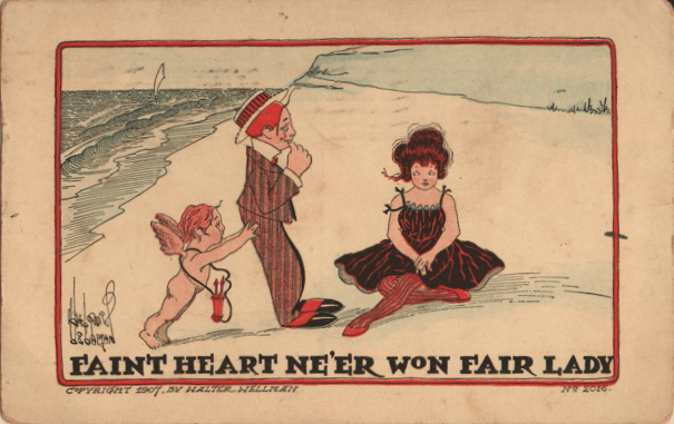 If you can’t make out the faded caption, this card says “Harmony, with apologies to Frank Dicksee”. We have lost interest in making catchphrases based on popular paintings, partly because we don’t bother nowadays with popular paintings. Sir Frank Dicksee was a painter best known for “The Funeral of a Viking” who also, in 1877, painted “Harmony”, which has nothing at all to do with the image here. A young woman plays the organ as light pours through stained glass and a romantic young man looks on. The joke was funny only to those who knew the painting, its artist, and title a generation after the painting hit the public imagination. The possibility that it wasn’t very funny even then does exist.
