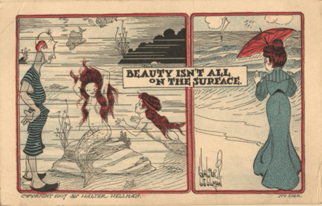 Here I am all at sea. I have been unable to trace the origin of this phrase, which seems to have been very popular in the first decade of the twentieth century, at least on postcards, where it always involves the beach and/or swimwear. Walter Wellman has turned it into something surreal, and I’m not sure I‘ve followed him all the way. Is the lady on the right just a contrast to the mermaids? Is the gentleman underwater, who does not seem to be wearing any breathing apparatus, a suitor or a disapproving parent? And is that…but we’re supposed to be looking at the mermaids, not him, so I just don’t know what all is going on. You tell me.