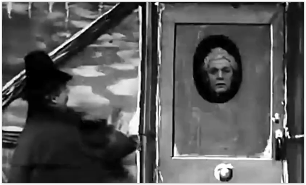 Scrooge’s house, obviously painted on a backdrop, and architecturally unlike any other Scrooge abode, is the setting for the one snippet available when I wrote my book: we watch as Scrooge pulls out his key, and a cutout appears over the doorknocker showing Jacob Marley’s face.