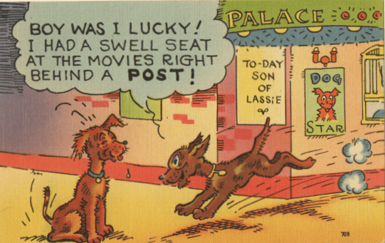 But the mid-century canine was also capable of cultural pursuits. Not only is there one glamourhound starring in the movie here, but one of the moviegoers has been moved to an appreciation of architectural layout.