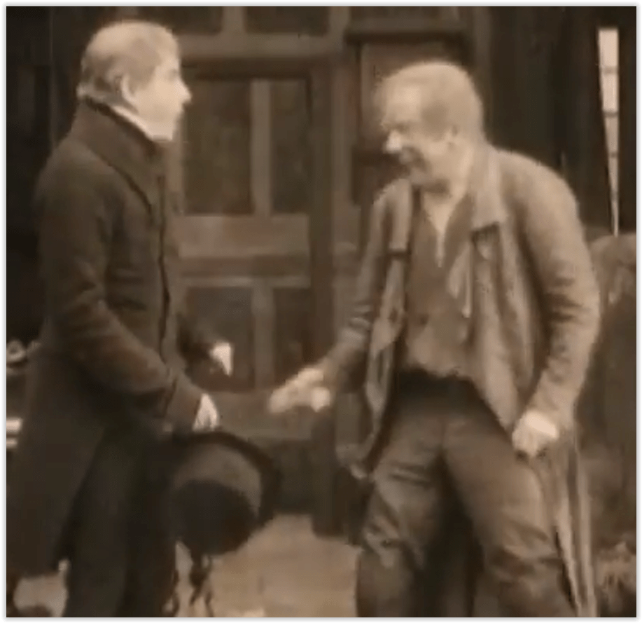 We jump to December 26 as Cratchit rushes into the office late and Scrooge plays his prank, suddenly calling his clerk “Bob” instead of “Cratchit” and eventually ordering him to go out and buy a ton of coal. He even, apparently, allows BOB to say “God Bless Us Every One”. Scrooge does get one last swirl of tone hand in the air to end the picture. (This gesture also turns up several times in the 1935 version. Must be a British thing; we see Bob make the same gesture on his way out to buy coal.)