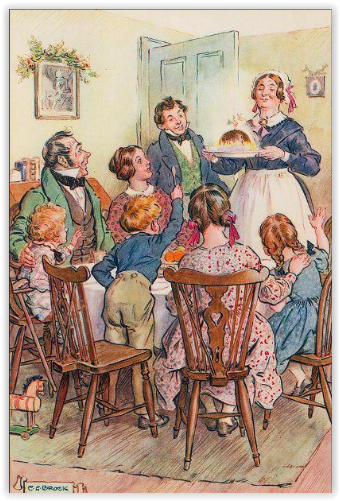 CRATCHIT DINNER AND TINY TIM: This is almost always present (in 1923 the whole family is omitted, and in 1922, they are not eating) just to show Scrooge a happy family, reproving him for his solitary and selfish nature. Tiny Tim has very little to do, though he does Martha’s hide and seek in 1914, and in 1901 actually gets to raise his toast. He is seldom named in the title cards (they assumed you’d READ the book, and KNEW). In 1922 and 1923 he is omitted, though he MIGHT be the small child playing with the abacus in 1922. Only in 1913 does Scrooge show much of an interest in him.