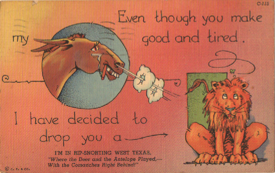 This is more of a marketing mystery. This basic joke here was very popular—people liked the ass gag—and I pulled it from inventory because you HAVE to list the more common cards. Only after I scanned it did I notice that remark about Rip-Snorting West Texas, which was NOT on other copies I had. Checking the mighty database of eBay, I find that the Curt Teich Company did this on at least two unrelated cards (the other is a fireman carrying a lady down a ladder.) How many cards did they repurpose for Rip-Snorting West Texas? Was it just one store in Amarillo (where most of the used versions of these have been mailed) and was it just those two cards or anything that was overstocked back at the warehouse? And did they do it for, say, East Los Angeles or North Woonsocket?