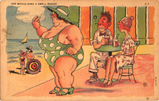 The next few are just glitches in joke history, that question you really ought never to ask: “Who told it first?” I also grew up with Spike Jones records, and of course, Doodles Weaver’s rendition of the dialogue on “William Tell Overture” (known to most of us as “Beetle Bomb”, which is how we heard the name of the racehorse Feitlebaum.) We hear how the progress of the race included Cabbage leading by a head and Girdle in the stretch. The record was so popular that a board game was based on it (with Beetle Bohm, so there.) But this card dates from before the 1948 release of the record. Did this cartoonist hear the song on the radio first, or are the jokes just so obvious they didn’t need to be swiped?