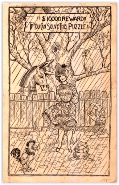 Let’s close with a classic. I still can’t figure out this picture puzzle. It’s not a matter of the money—the prize must have vanished generations ago—or even, at this point, of pride. I never can figure out who the murderer was until the detective explains it to me and I would not care to see my win percentage on the daily Jumble. I just want to know. What IS this incredibly complex rebus trying to communicate? No, I KNOW it isn’t going to be worth the trouble. Why should THIS postcard mystery be different?