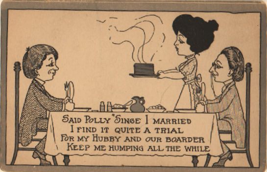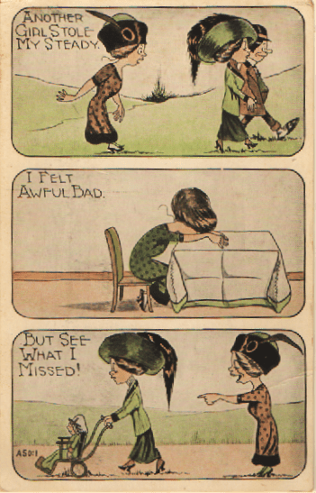 You can tell from the ladies’ garments that this postcard comes from a generation before those aging cattle. It may just be my modern imagination that makes me hunt for any sign of a wedding ring on the finger of the “successful” rival, the joke nonetheless depends on an understanding of the potential side effects of romance.