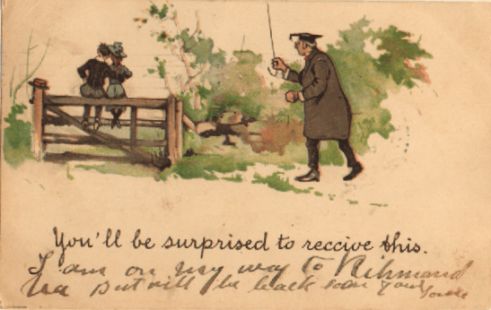 It may be just OUR generation who would blush at this, I suppose. The era before World War I was used to schoolmasters in loco parentis (“in place of parents”, essential in a boarding school or college where a kid’s natural parents weren’t around) AND the liberal use of the cane. And yet our cartoonist has spent extra time emphasizing the targets available on the couple. This could have been just to make sure we knew who was going to be the butt of the joke.