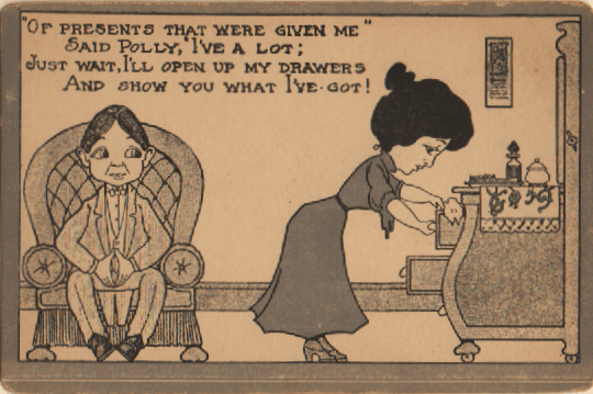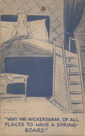 Polly’s arcade cards date from about twenty years before Mr. Wickersham’s acrobatic bedroom, and delight in accidental naughtiness. Her remarks could be perfectly unobjectionable if we weren’t aware that this scene wouldn’t even BE on an arcade card without another interpretation.