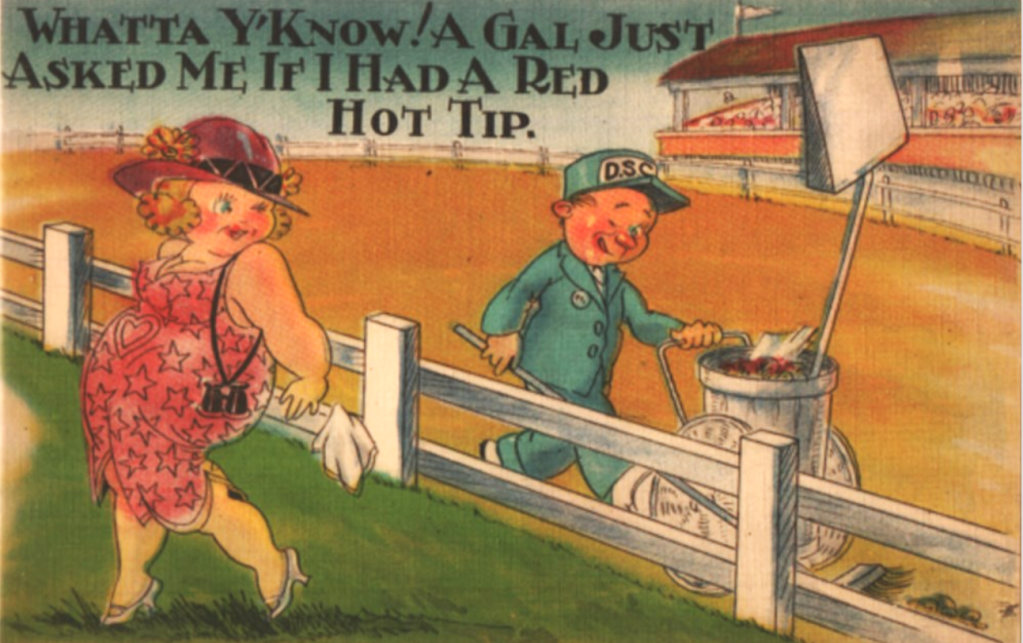 But naughtiness was not restricted to arcade cards. Here we have a genuine postcard which could be sent through the mails in the 1930s by people who could always argue that THEY thought it was just about gambling. This one wasn’t; it probably belonged to someone who explained to her parents that this was just the sort of thing to amuse Jack at college, and then quietly slipped it into her album. Never underestimate your ancestors.