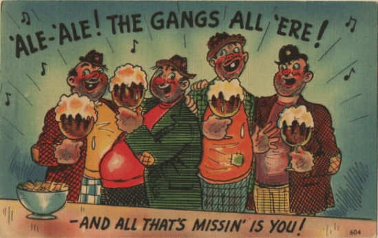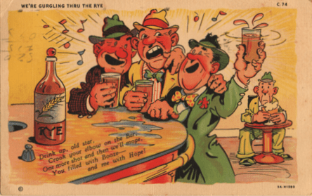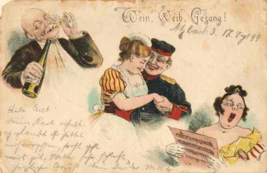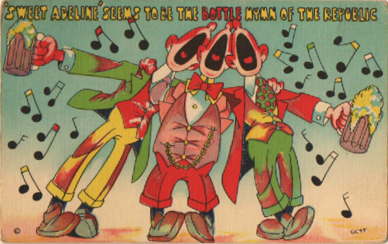 The association of wine, women, and song is an ancient one, and carries cultural baggage too multitudinous to unpack in a single blog (or year of blogs). The tradition in comedy of singing among men who have lubricated their windpipes sufficiently to break down discretion is also a bit much to consider in one blog, but one comic convention frequently expressed on bygone postcards is the association of certain songs with high (and plentiful) spirits.