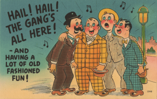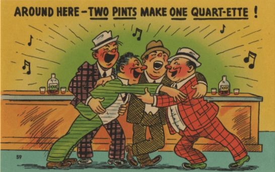 The connection between people who sing over a sudsy mug is just one connection between singers in saloons and the barbershop quartet. The quartets, among the first pop groups available for your phonograph, helped make Sweet Adeline a hit, and were instrumental (sorry) in making any group of four think harmonizing was easy. One of the popular songs from the “absent friends” tradition, That Old Gang of Mine, in fact mourns the days when they sang together.