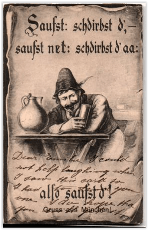 Here. We’ve covered this before. This Bavarian postcard of 1906 or thereabouts simply quotes a German drinking song. Nobody seems to know or care when it first appeared, and though I can find videos of old men singing it in bars, no one will give me a translation. I gave up translating foreign songs after my record-breaking version of “The March of the Kings” (one person who heard it was so dismayed he dropped his 78 of “Blues My Naughty Sweetie Gives to Me”.) But as far as I can determine, the lyrics are something like “drink and tinkle and drink and tinkle and drink and tinkle again.” Makes “How Dry I Am” sound like the Hallelujah Chorus.