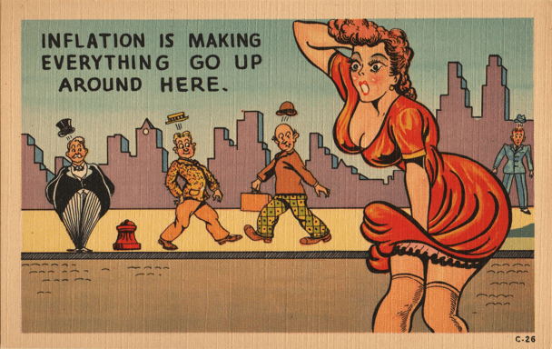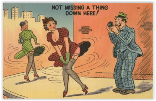 Really short skirts and the decline of postcards in the sixties muted the joke, perhaps, and attention moved over to the equally old joke of how a lady gets out of a vehicle without showing too much of what the skirts were supposed to cover. The joke, like the weather that caused it, remains, and will probably never QUITE disappear.