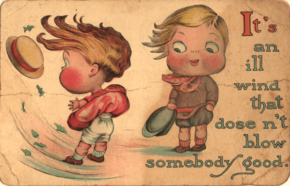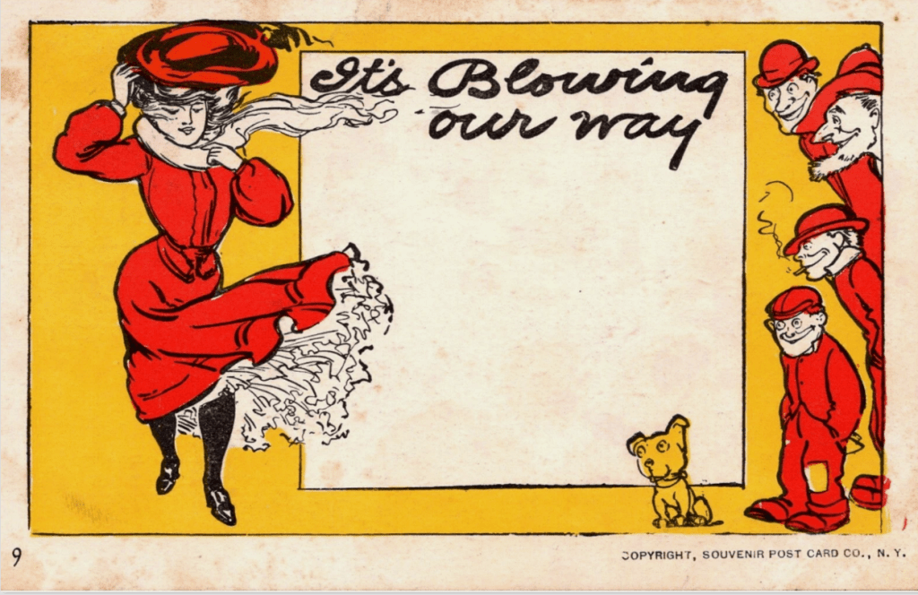 But there was a theme that was simply too all over everywhere to ignore. The single most popular mishap in the world of clothing was the strong breeze. A high wind could takes skirts higher than intended to the delight of the passing voyeur. The tradition was passed along for generations, along with the joke about the lady who was reproved for hanging onto her hat in a high wind instead of attending to covering up farther down. (If you are not up on your Fine Old Jokes, the punchline is, “The hat’s brand new. What those guys are looking at is twenty-three years old.”)