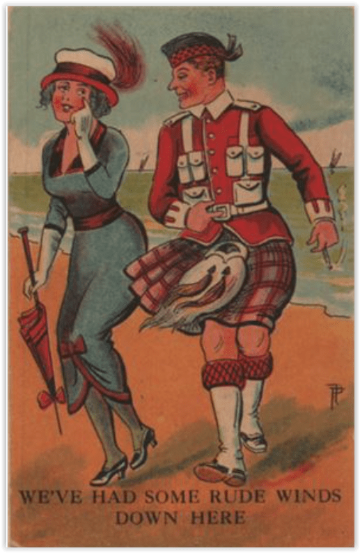 It has been applied, in fact, in places one might not expect. But we can dissect the humor of this card someday when we have more space to consider kilt humor, and the various uses of the word “wind”. We are, I think, doomed to wonder just why the young lady, who is wearing one of the few styles of skirt which will NOT accommodate the joke, is blushing about.