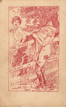 In our last thrilling episode, we were considering the Windy Day school of Wardrobe Malfunction postcards. These small cardboard jokes were aimed primarily at a bit more leg exposure than was allowed the average woman going about her daily chores. But if the breezes did not cooperate, an artist could resort to more slapstick methods of exposing an ankle, calf, or thigh. THIS theme goes back to the early days of postcard humor, as you can see above.