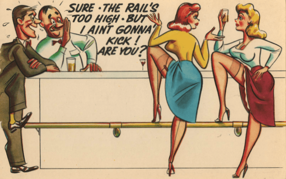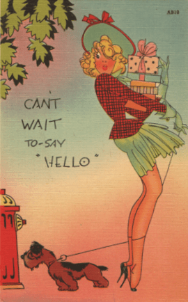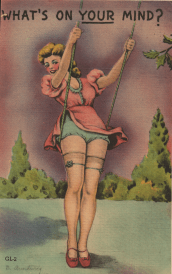 A dog’s leash, an inconvenient door: anything that would keep a lady’s hands occupied so she couldn’t hold her skirt down would do. One artist, Art Frahm, specialized in pinups which made matters worse by not only having a skirt fly up while the lady was trying to untangle herself from a leash, but would also make it clear that the elastic in her underdrawers had given way at the same time (though the skirt was generally flying up in a way that denied anything too intimate from being displayed to us, the viewers. What onlookers at the scene saw was left to our imagination.) But postcards were generally too subject to postal inspection for this degree of catastrophe.