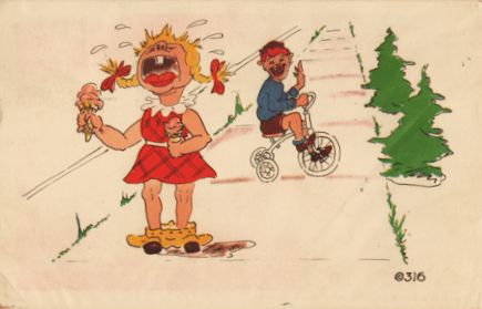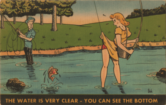 It was not even necessary for the lady in question to realize what was going on. The postcard artist could instead capture a moment before it all sank in.