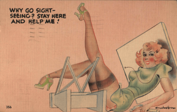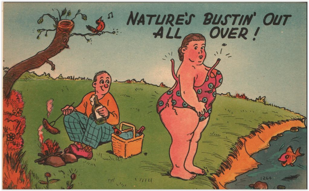 There was never any real plan to do a dissertation on the history of wardrobe malfunctions in art, even just in postcard art. However, the possibilities of revealing accidents are limitless, and it is a fear common to most of us, regardless of class or gender. As a mighty philosopher once stated, “Everybody’s got a naked.”