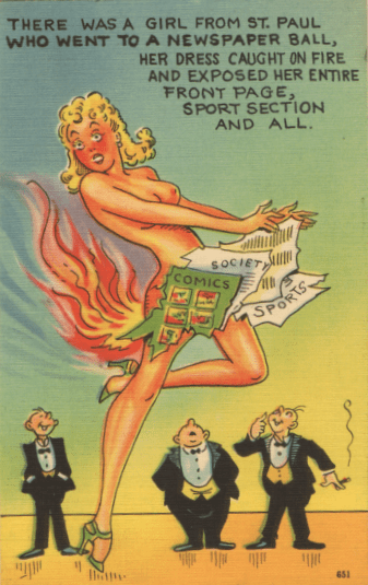 This is about as serious as the accidents get. I hate to be THAT blogger, but this card, neatly as it depicts the scene, does not use the best version of the limerick in question, which specified that the lady from St. Paul WAS wearing a Newspaper Dress and asked us to commiserate with someone who burned her entire Sporting Section. Maybe the verse as originally written didn’t fit on the card.