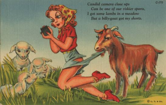 Clothes which got torn (or in this case, chewed off) provided another theme common to all ages and levels of society. THIS lady is a very intent artist, or the goat is working very quickly. She also teaches us an important lesson, which is that we must not forget our underdrawers when going on a photographic safari. (Not sure how this got past the editors; a lot of wardrobe malfunction postcards show clearly where the Powers That Were said “Okay, put a thin black line right here so everyone knows she IS wearing underpants.”)