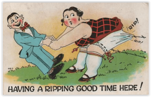 Here we have a fie example (or a ripping good case) of bygone slang providing the basis for a joke. In the United States, a “ripping good time” was a phrase used primarily among the flaming youth of the 1920s.