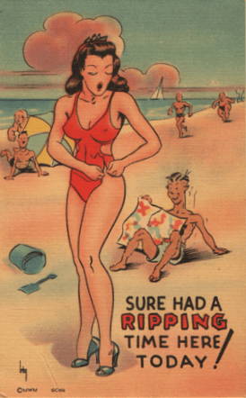 Of course, where the wardrobe malfunction postcard is most functional is in fashion history. Correct me if I am reading too much value into cartoons and social history, but THIS particular gag wasn’t really possible in the days when bathing suits were more voluminous and less formfitting. Yes, the Edwardians had their torn swimsuit cartoons, but a lady putting on the swimsuit and realizing that, well, it has obviously shrunk over the winter belong to a later age.