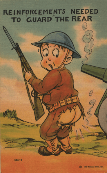 And, as ever, the joke was not always on the ladies. The cartoonists of the First AND Second World Wars (at least) could never resist this particular military jargon. Although here we are left rather in doubt about just what HAPPENED to the soldier’s trousers. He is, quite properly, facing the foe, so was this friendly fire? Is the percussive shock of that bit of artillery being fired rough enough to…anyway, the cartoonist couldn’t resist the possibilities and a fine old joke is a fine old joke.