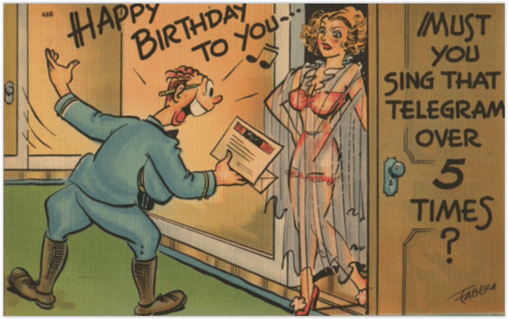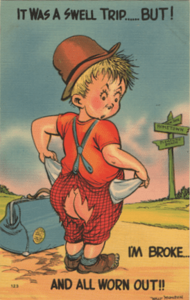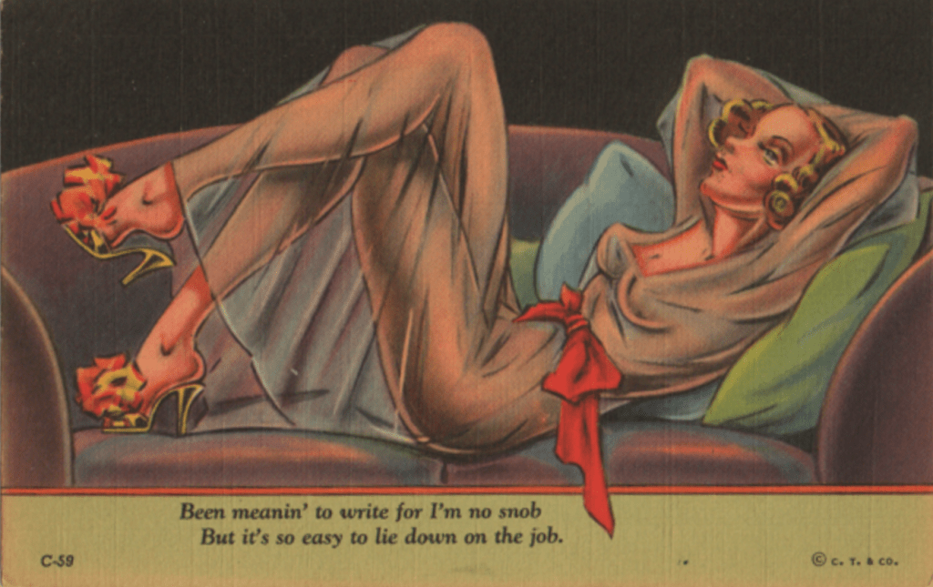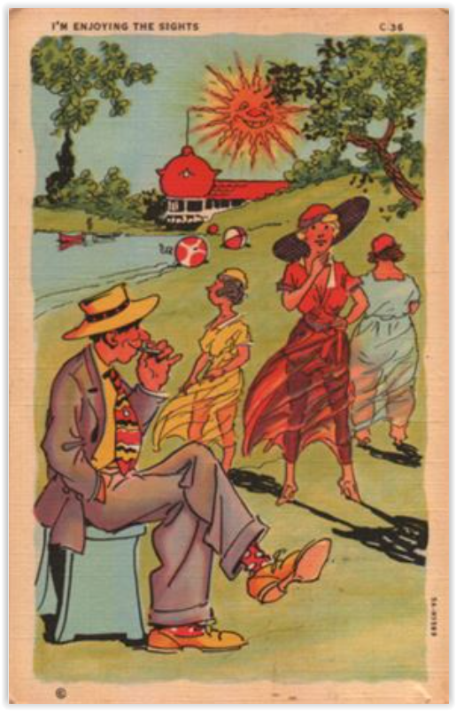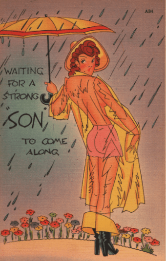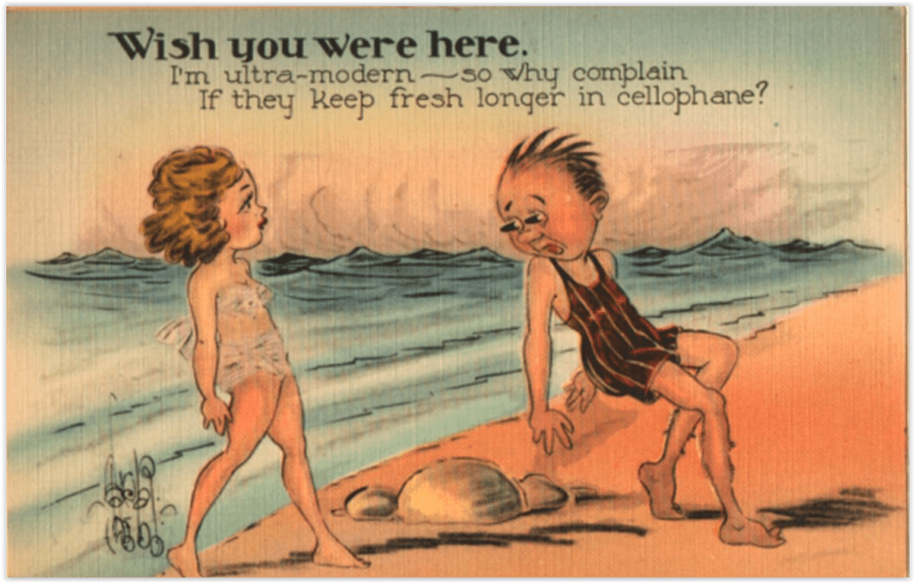 No, we’re not quite done with our discussion of wardrobe malfunction gags on vintage postcards. We have not even addressed transparency, and THAT, I know, is an up-to-date atter for discussion and debate. I check those articles on transparency in business for useful photos, but maybe I’m missing something. Anyway, this first postcard doesn’t count, since that is INTENTIONAL transparency. (We mentioned hereintofore the delicate lines that were drawn in to assure any post office censors that the model is NOT naked under that sheer raincoat. Hose shorts are nearly as magical as the raincoat, but they ARE there.)