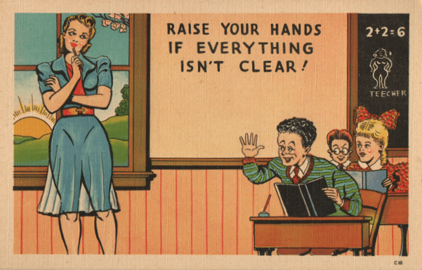 For one thing, this means the accidental nudity is largely a matter of silhouette, whereas real transparency would have meant details the mailman was forbidden to deliver. (There’s a lot going on in the details here. You can see that the female student looks angry—was the cartoonist implying sympathy or jealousy?—and the blackboard shows that she teaches anatomy more efficiently than she does spelling.)