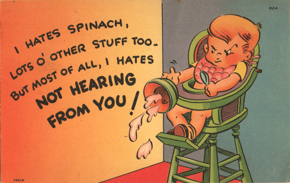 Anyhow, I recently acquired a large collection of postcards described as “romance and marriage, which included a half dozen of these wordy cards. Be warned that they do deal with the fantasy and reality of both. Oh, and as seen by the one at the top of this column, some of them are examples of just Too Many Words. This leaves the sender nothing to say (which may have been the point.)