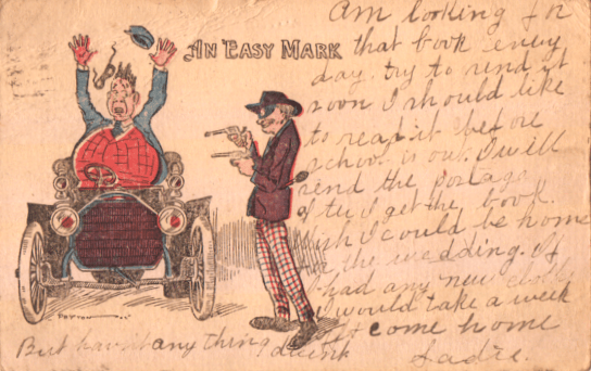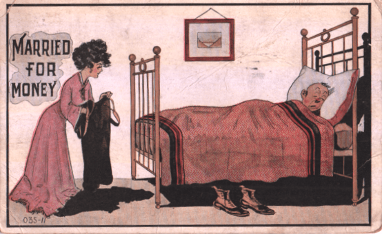 One of the most reliable gambits for the cartoonists preparing our postcards in days of old was marital discord. And among the prime choices of causes for marital discord was one that just about any postcard buyer could sympathize with was financing said marriage. Long before a genius noted that “Romance without finance ain’t got no chance”, we were arguing about whether “Two can live as cheaply as one.”