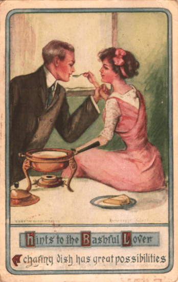 There are not nearly so many postcards discussing what happens when two people manage to slip off to the kitchen to heat something up, but they do exist, this cowboy cuisine version being one of the most recent examples. (I admit to some curiosity about what they’ll be enjoying later, but the way they’re cooking, it won’t be what’s in that pot.)