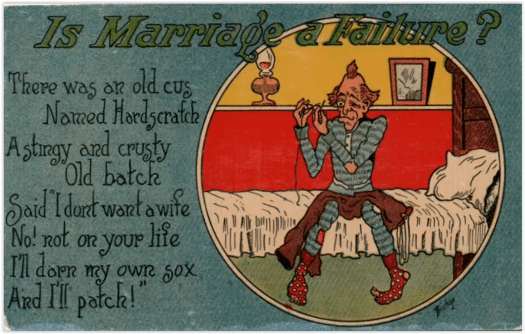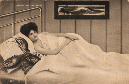 This was meant to simply be funny, not horror fodder at all. “Lobster” has been used for various people over the decades, sometimes for a rich man, sometimes for one who was merely surly. This card laughs at the idea that any woman would voluntarily get into bed with an unpleasant person just because he’s rich. It’s the incongruity that matters, the unlikelihood: not the scary picture.