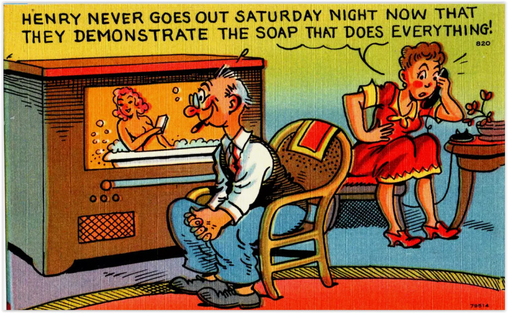 There is never the usual outpouring of response when my column deals with bygone jokes I just can’t figure out. But I have to produce these now and again. A blogger always runs the risk of being considered omniscient and infallible, and I MUST do my best to correct this notion before someone demands I take over the government, or the banks, or the newspaper funnies pages and run these institutions properly. So I present here postcards like the one above, which obviously had a point about women and beauty treatments. Can’t quite see it: were we commenting on the fashion for beauty spots, or was there a fad for sprouting mushrooms around your mouth?