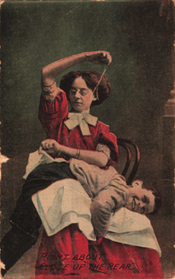 You can tell by the victim’s face here that he is perfectly comfortable having the seat of his britches mended. You were supposed to laugh at the joke about “closing up the rear”, not quiver on the edge of your seat with suspense at whether the short-sighted attacker can be trusted with that needle.