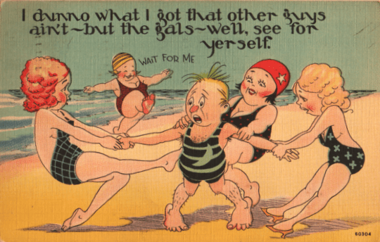 This, now, addresses another sort of predator on the beach, and is by artist Ray Walters, of whom you will see a lot in this folder and, indeed, in any collection of Curt Teich comic postcards. This is not really his best work. I don’t understand why anybody would dive into the water with a cigar and…. What was that? Oh, you think so. I see, and that “bang bang” has more than the two meanings I saw? You could be right, but in that case…well, that cigar is still going to go out and get soggy once he hits the water.