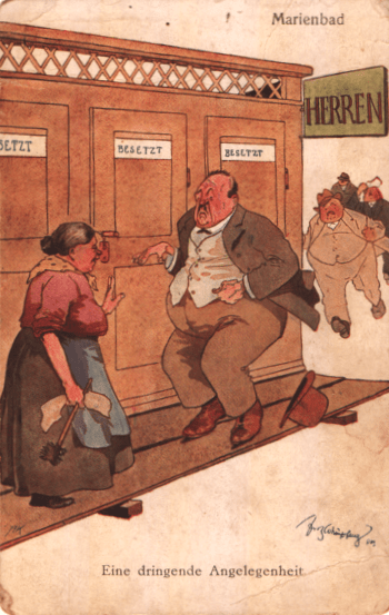 If we look for genuine nightmares in our Halloween greetings, we might take this picture of a health spa where large men drinking from the mineral springs to renew their youth discover all the restrooms are already occupied. Can’t immediately recall any really four-star horror movies that used this idea, but perhaps we’d be ahead of the curve. (Or at least at the front of the line.)