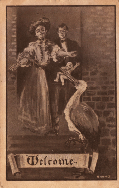 This, also, could do as a Halloween card only in a pinch. Yes, the man saying “ootsy boo boo” to the baby IS a tad frightening. But this artist was great at grotesque faces, and if you look more closely, with a saturnine attitude, everyone in the picture seems to be wearing a weird mask.