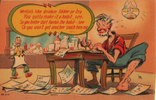 Action is reserved for times of need: as when a customer orders another drink and the bartender has a faint suspicion that this would be a bad idea. Knowing when and how to cut off a customer is nearly as important to a bartender as knowing what kind of glass to use for an Old-Fashioned. The postcard, as opposed to poems and songs in American literature, usually takes the side of the bartender in these discussions.