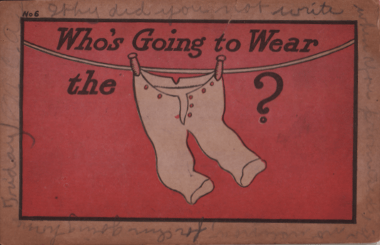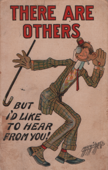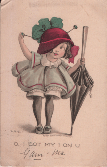 And the hatpins you have probably noticed in this and the previous postcard are also largely gone, except as things you turn up at a flea market and say “What the heck is THIS for?” Maybe women don’t wear hats the way they once did, or maybe they don’t wear hair that would hold onto a hatpin, or maybe they’ve just found a better way to handle the whole problem. (Anyway, don’t you have to let that hat blow off anyhow if you’re planning a Meet Cute for your rom-com?)