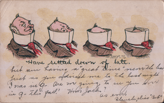 Coming down toward the floor, we find two more articles essential to a postcard saloon. One of these is the cuspidor, or, more vulgarly, the spittoon (there were less pleasant names for it, but we were just discussing food, after all.) The custom of chewing tobacco, at one time apparently nearly universal among Americans (visitors from Europe were always commenting on this), was on the wane, partly because cigarettes had become cheaper and more acceptable socially. But even though tobacco spitting gags were pretty much retired by the time postcards came along (thank goodness), the habit itself never disappeared, and the saloon liked to be known as a place where men could relax and indulge in habits that society (and or wives) didn’t care to see could be indulged. (This also explains all the pin-ups you see tacked to walls in postcard bars, but that’s a whole nother blog.)