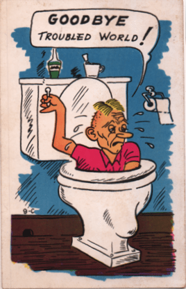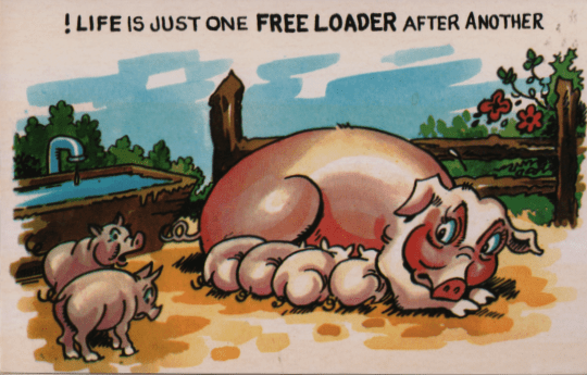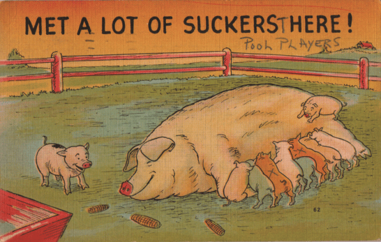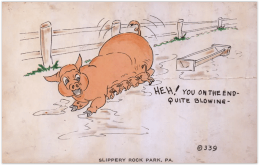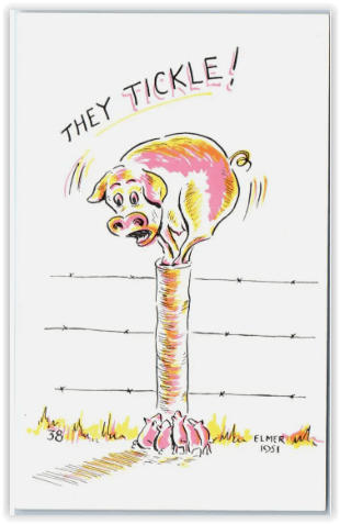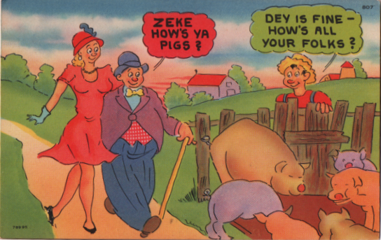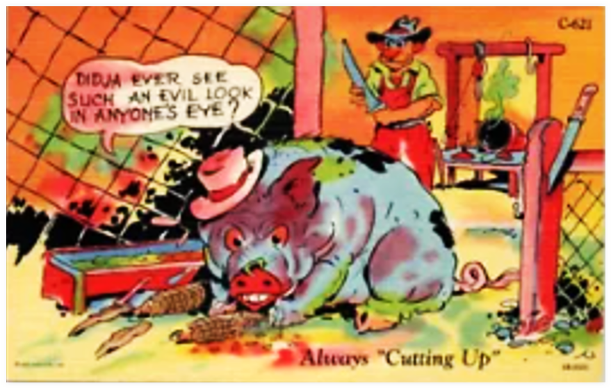 Maybe it’s just a matter of pigs being easy to draw (One big fat oval, a circle, and a snout) or that little piggies are so cute, that make for so many mama-and-piglets postcards. Or perhaps, like the conspiracy theorists, we just see our own plight in the life of the pig. (Note on vocabulary: I did grow up in pork producing territory, where the word ‘hog’ was everywhere and ‘pig’ was used only when referring to Porky, on TV. Postcard artists, as well as other comic creators, just seem to think ‘pig’ is the funnier word, so I have followed suit. I need all the help I can get.)