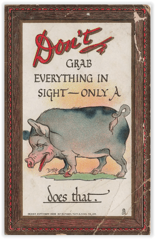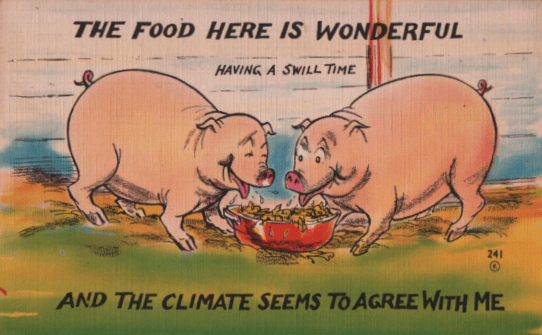 There were outliers, of course—a few postcard pigs made loud nises, and some were simply there to be fat without considering their dining habits—but by and large, pigs were what the educational community once called “eager eaters” (as opposed to picky eaters.) Eager eating was encouraged among small children, despite all the postcards which warned them not to be a pig.
